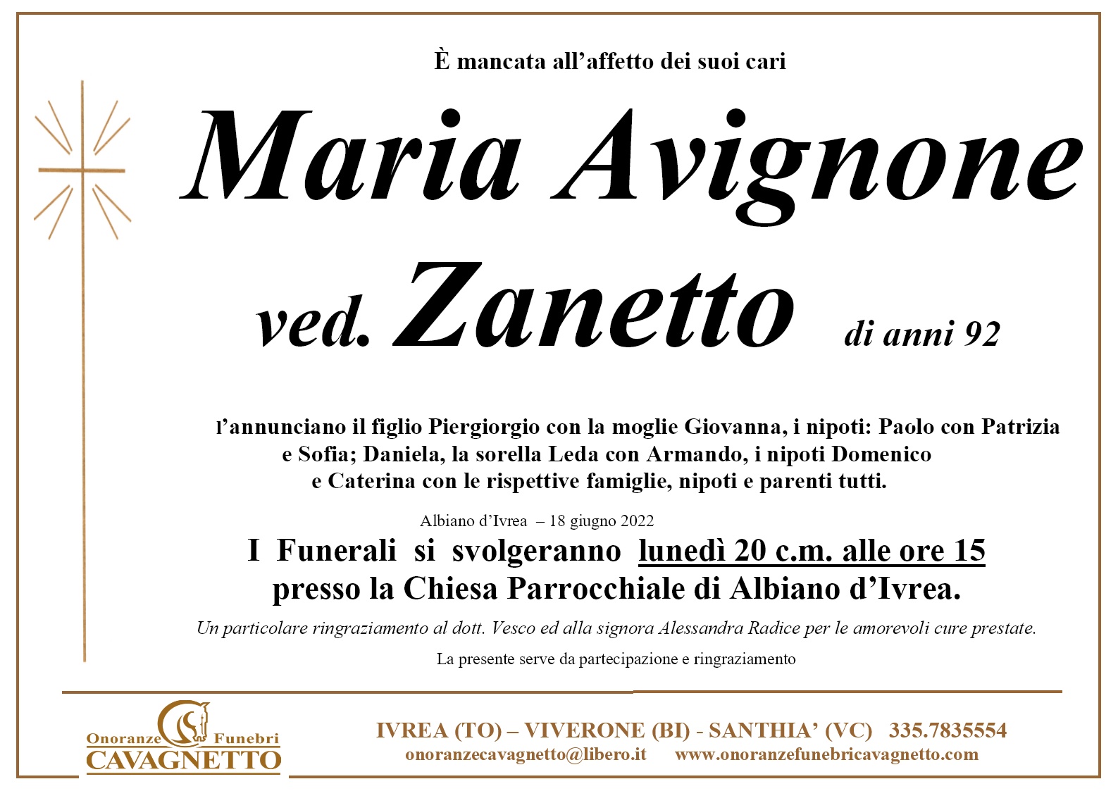 • Data funerale: 20.06.22 alle ore 15:00
